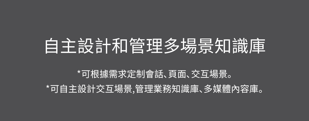 *可自主設(shè)計(jì)交互場(chǎng)景,管理業(yè)務(wù)知識(shí)庫(kù)、多媒體內(nèi)容庫(kù)。