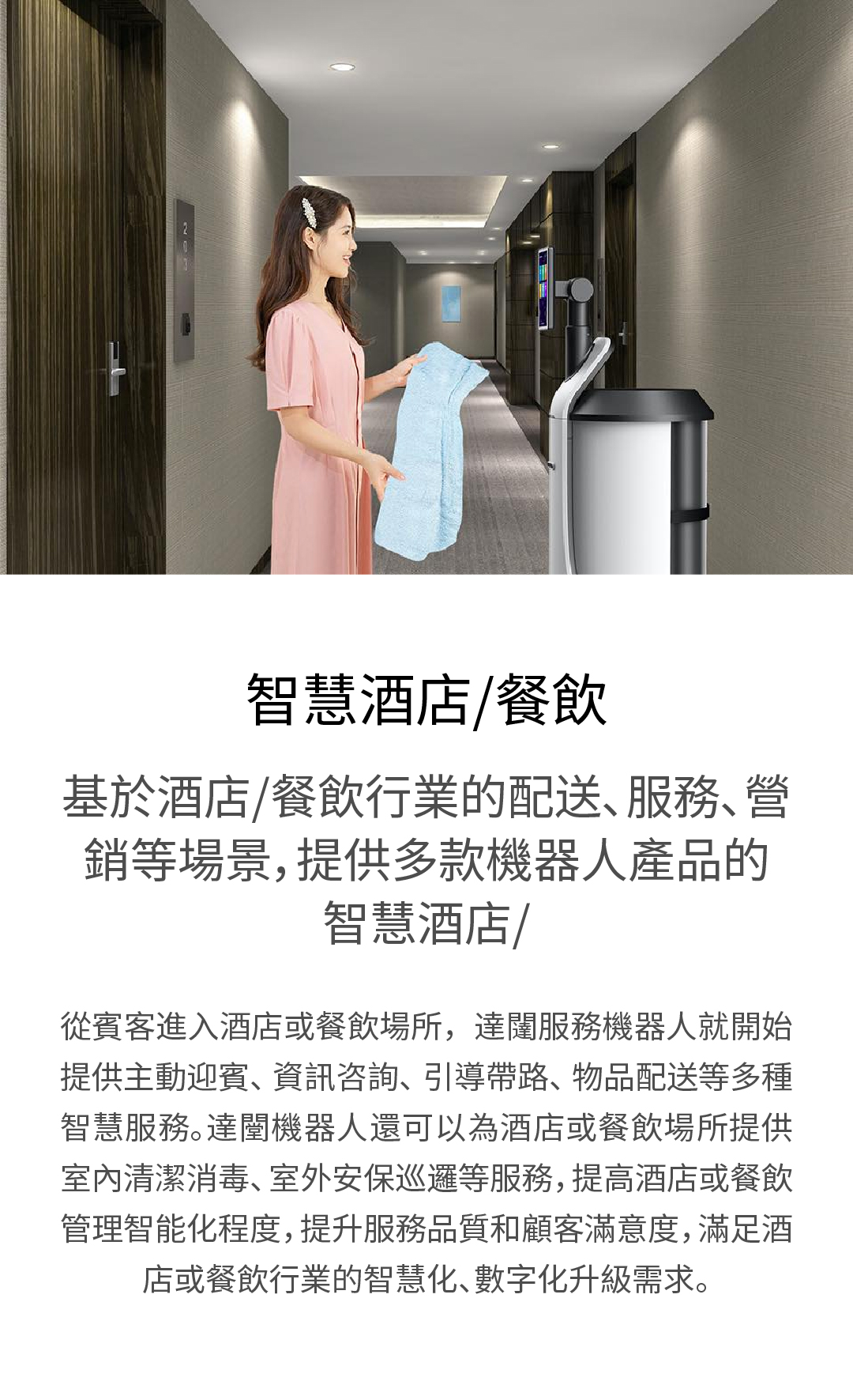 基於酒店/餐飲行業的配送、服務、營銷等場景,提供多款機器人產品的智慧酒店/