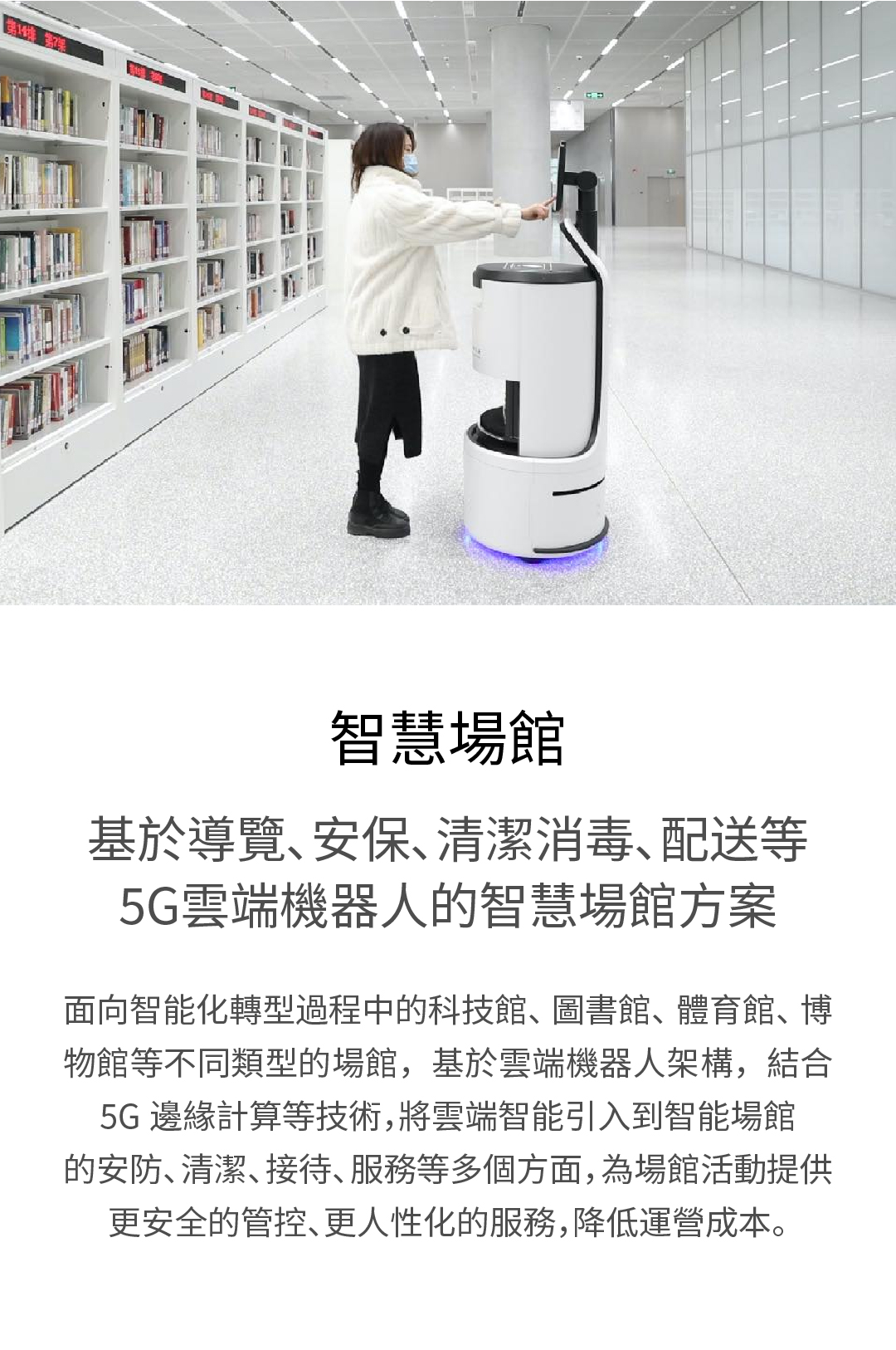 基於導覽、安保、清潔消毒、配送等 5G雲端機器人的智慧場館方案