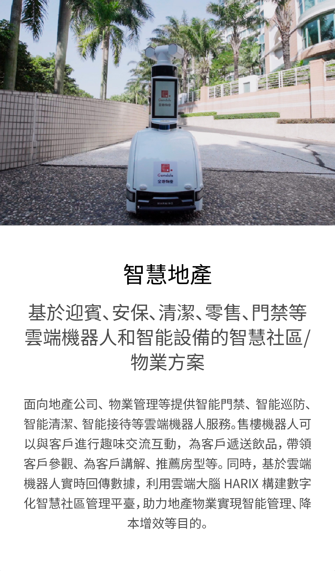 面向地產公司、物業管理等提供智能門禁、智能巡防、智能清潔、智能接待等雲端