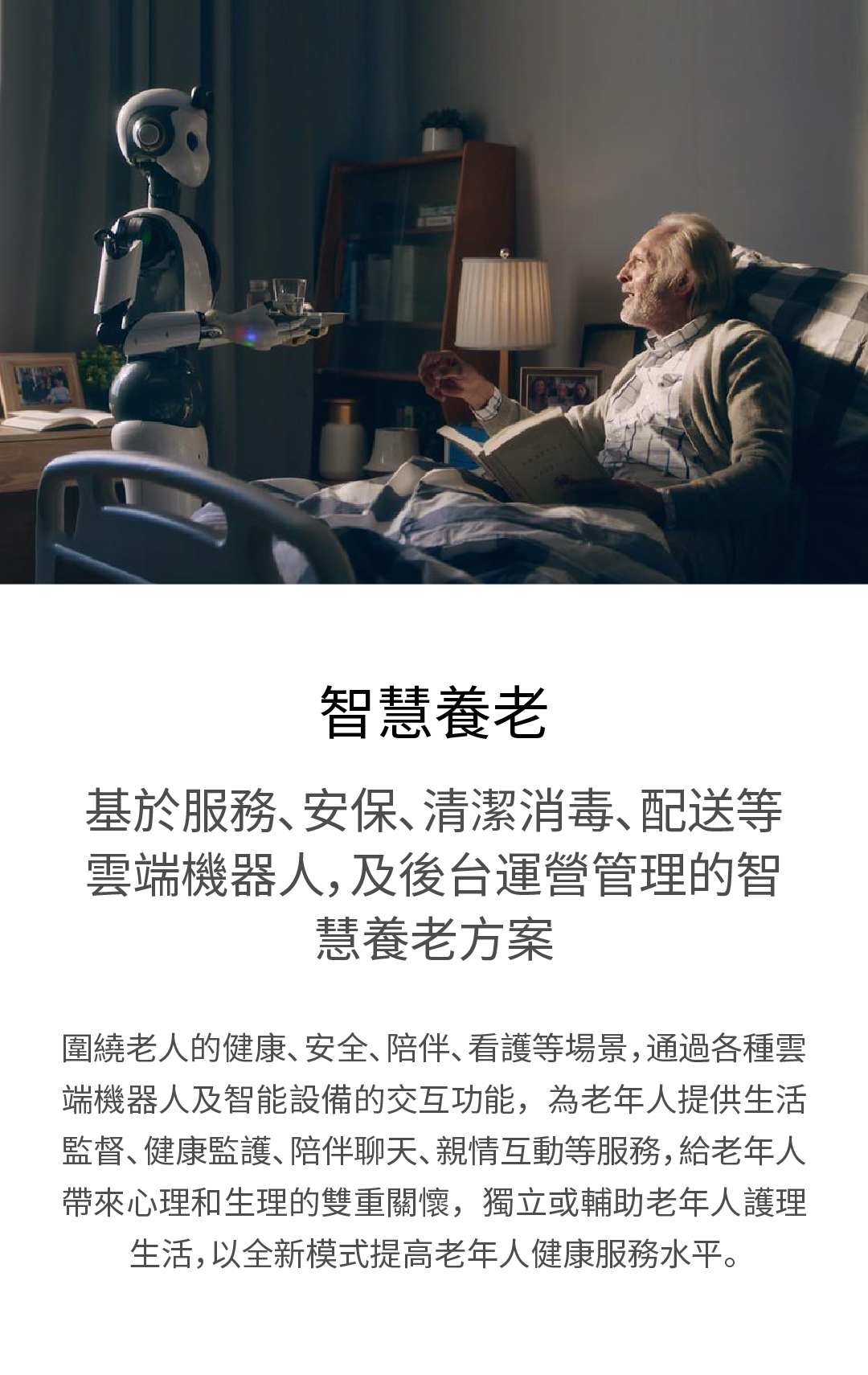 圍繞老人的健康、安全、陪伴、看護等場景,通過各種雲端機器人及智能設備的交
