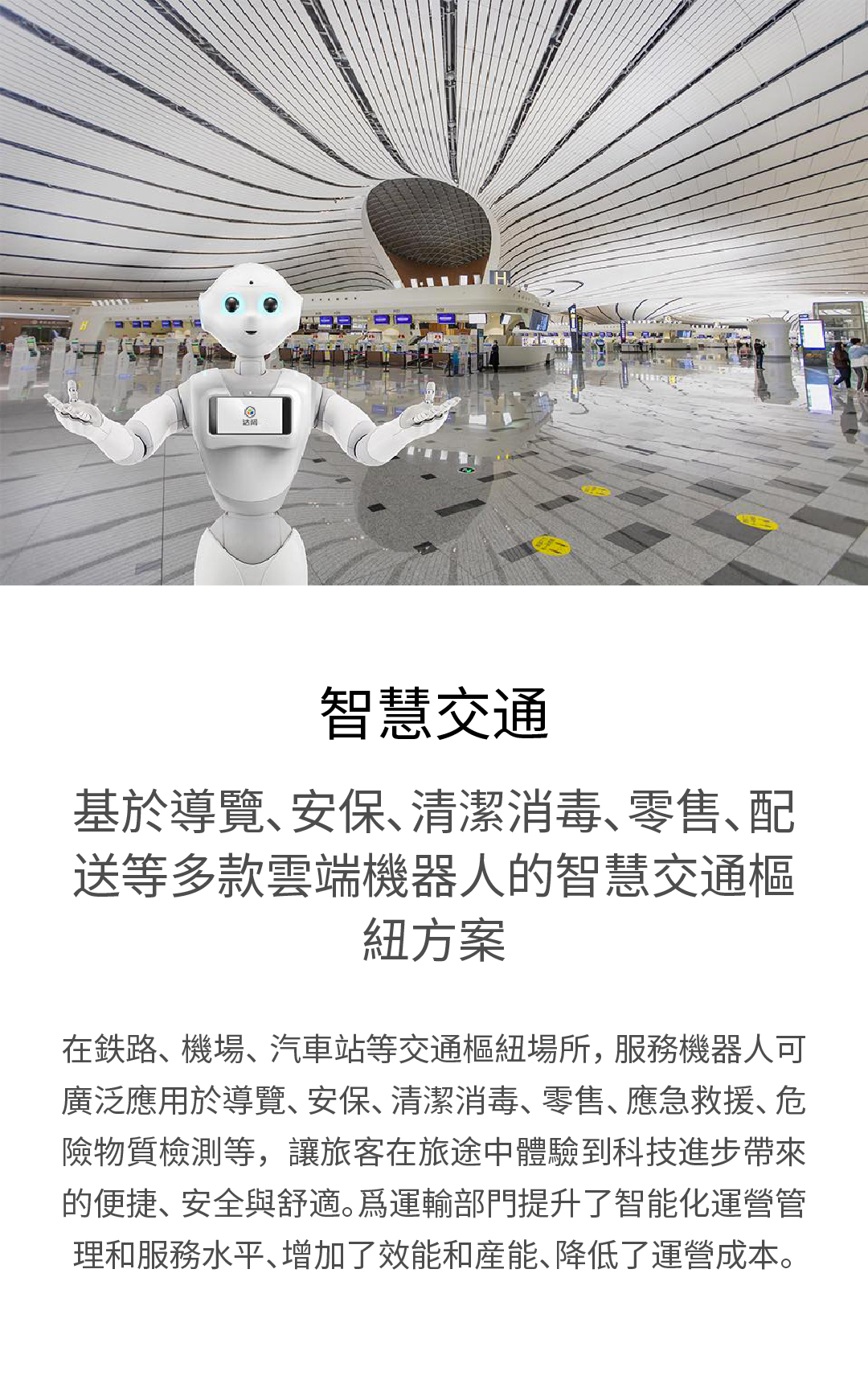 基於導覽、安保、清潔消毒、零售、配送等多款雲端機器人的智慧交通樞紐方案