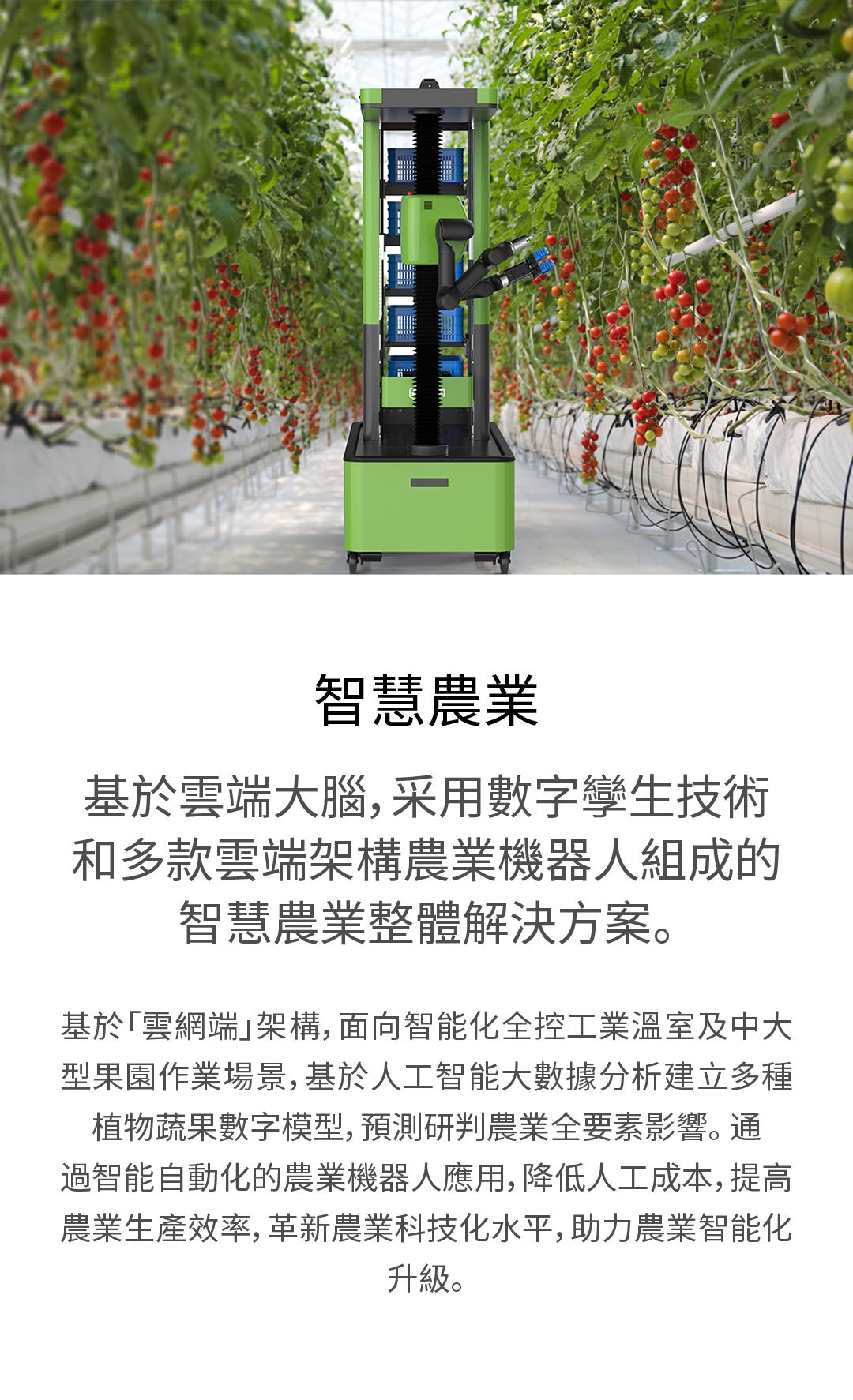 基於「雲網端」架構,面向智能化全控工業溫室及中大型果園作業場景,基於人