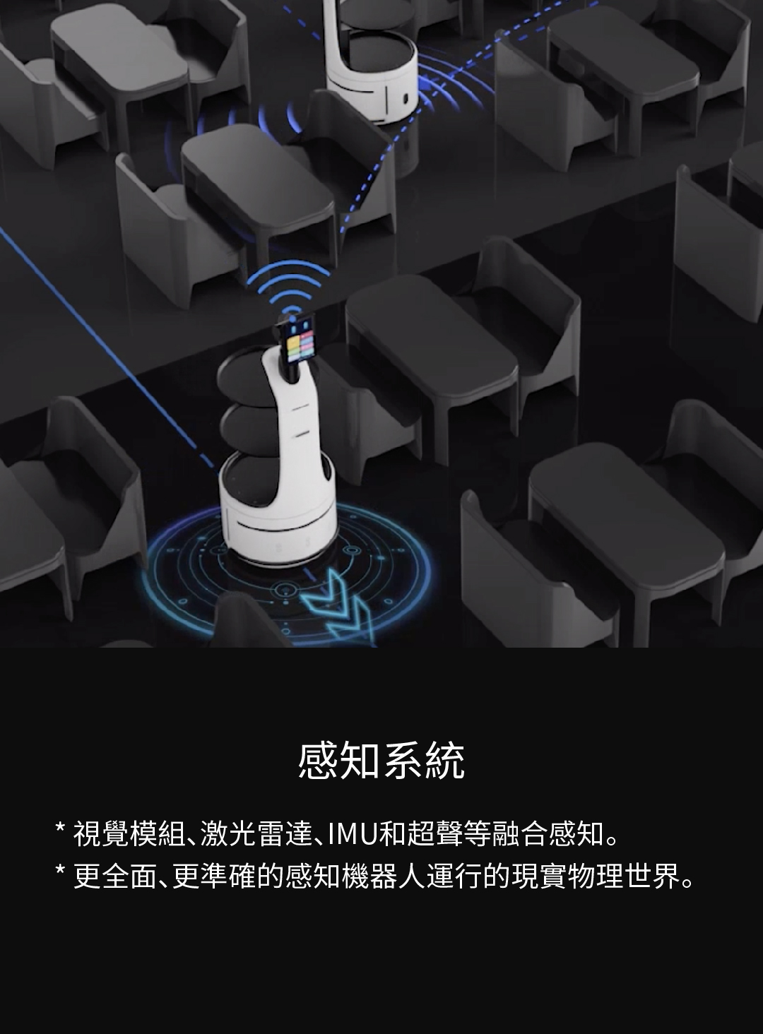 * 視覺模組、激光雷達、IMU和超聲等融合感知。