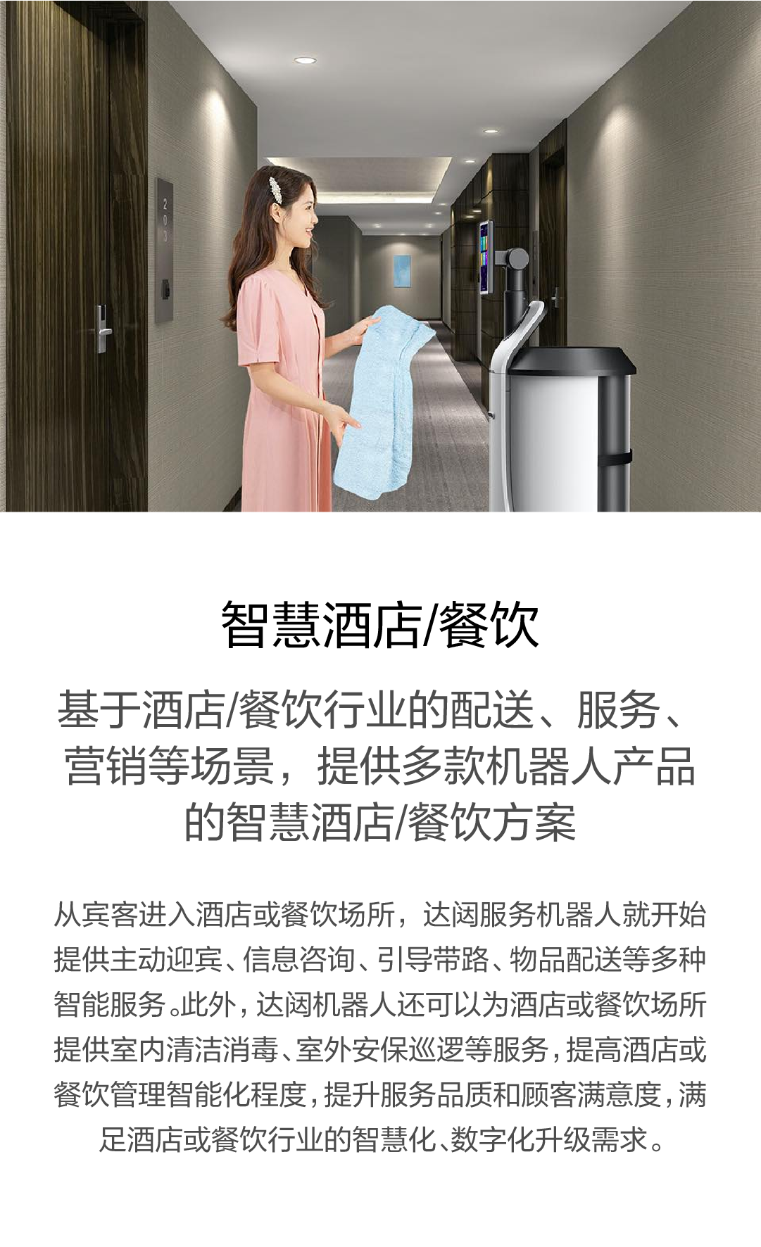 基于酒店/餐飲行業(yè)的配送、服務(wù)、營(yíng)銷(xiāo)等場(chǎng)景,提供多款機(jī)器人產(chǎn)品的智慧酒店/