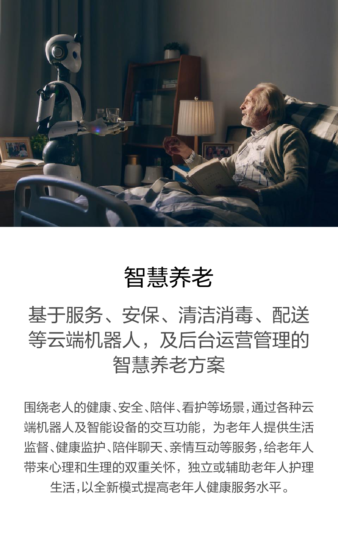 圍繞老人的健康、安全、陪伴、看護(hù)等場(chǎng)景,通過(guò)各種云端機(jī)器人及智能設(shè)備的交