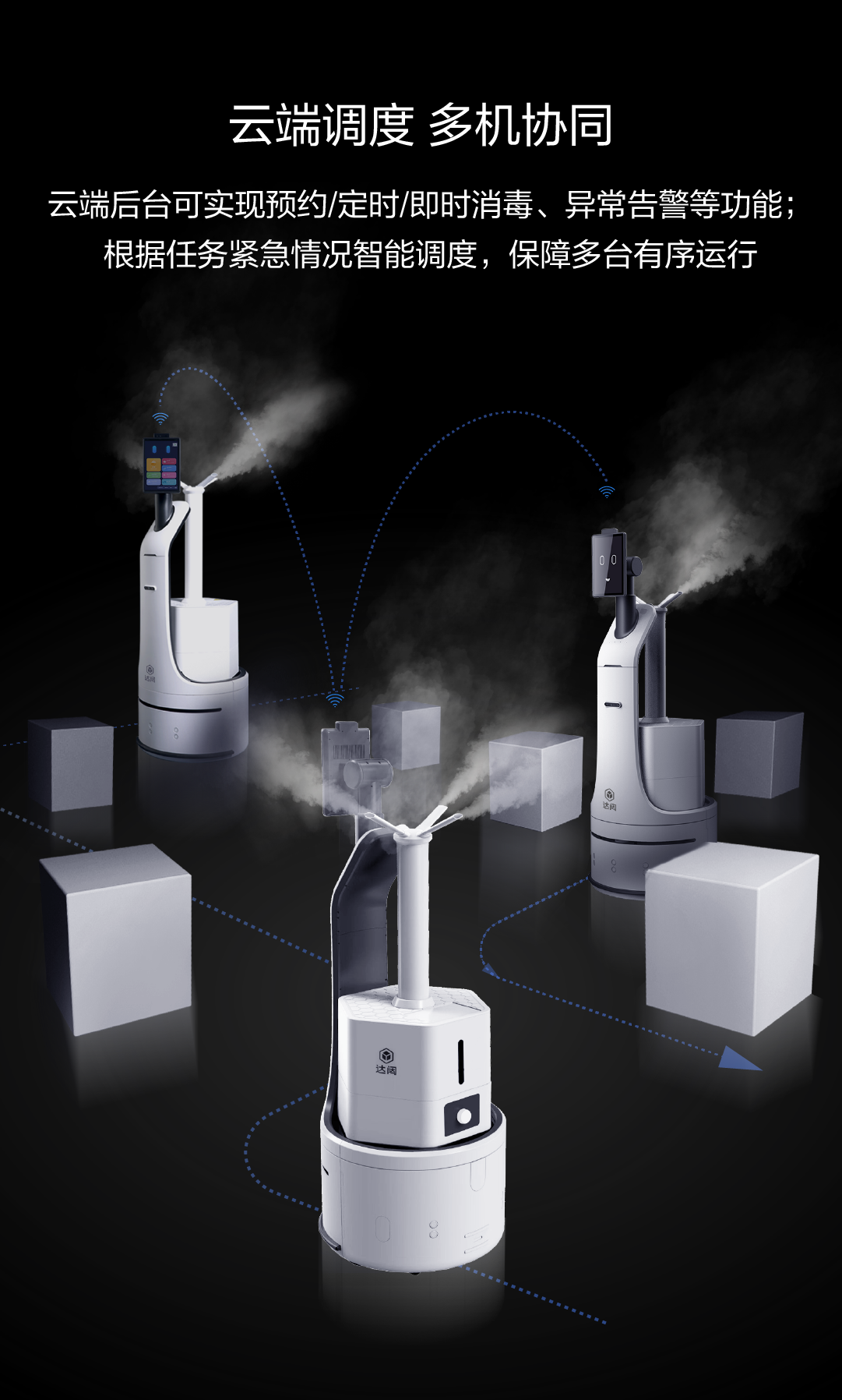 云端后臺可實現預約/定時/即時消毒、異常告警等功能;根據任務緊急情況智能調度,保障多臺有序運行
